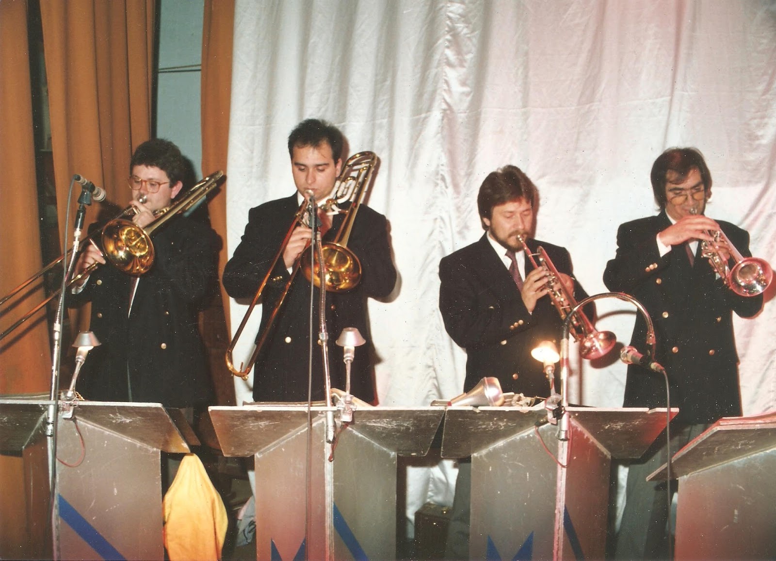 Al mig, a l'esquerra, el metall: Josep Lluís ["Pitu"] Castelló (trombó), Robert Bosch ["Pacheco"] (trompeta), Olegari Freixas i Darder ["Gari"] (trompeta) i Jordi Peña (trombó)