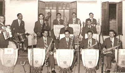 De dalt a baix: Ramon Expósito ["Ramon de Sant Julià"], Ferran Ripoll*, Josep Genís, Llorenç Sabaté, Francesc ["Cari"] Pomés, Narcís Miquel ["Siset"], Desideri Brugués ["Dèri"], Josep Mª Roviras ["Xivi"], Martí Genís (amb qui vaig coincidir un parell de temporades a la Cobla La Principal d'Olot), Francesc ["Paco"] Marcos (cantant), Carles Varela i Antoni Mediñà ["Toni Gros"].