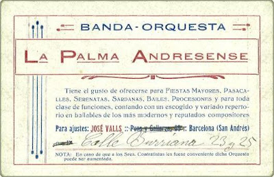 Revers de la postal. Tenien la seu al Carrer Borriana, 23-25, havent estat abans al Carrer Pons i Gallarza, 69. El representant era Josep Valls, patriarca de la família, que és el músic de dalt de tot, a la dreta.