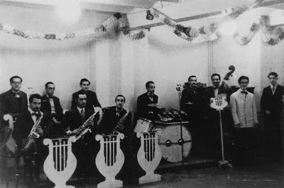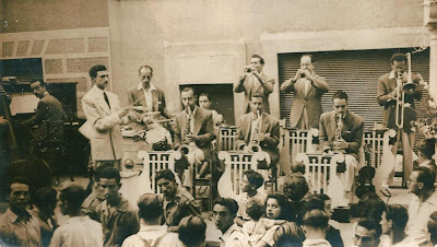 Darrere: Josep Sendrós (trombó), Calabuig (trompeta), Josep Jené (trompeta), Rafel Bonnin (bateria), Ramon Callejas (piano), Desconegut (contrabaix), Antonio Moreno (cantant i guitarra, que en realitat es deia Pere Rosquellas) i Desconegut (no sé quin instrument)