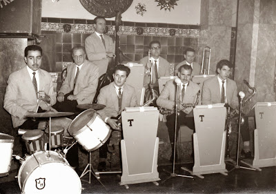 Davant: Joan Mañé (bateria), Lluís Canals (saxo alt), Jeroni Trayner (saxo alt) i Joaquim Riumalló (saxo tenor i cantant).