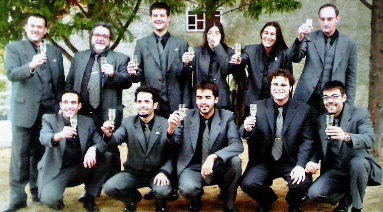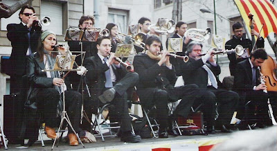 Davant: Joan-Miquel Giro i Farrés [sense accent a Giro] (trompeta), David Escobar i Gázquez (trompeta), Juan José ["Juanjo"] Rocha (tible), Àngel Fernández i García (fiscorn), Eutimi ("Timi") Rodríguez i Vázquez (trompeta), David Estañol i Martells (tenora) i Francesc Lozano i Arnau.