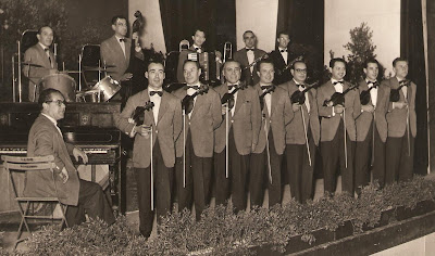 Darrere: Antoni Frigola (2n trompeta), Enric Martí (1er trompeta), Desconegut (1er fiscorn), Vicenç Pericàs (2n fiscorn), Josep Boldú (trombó) i Joaquim Morales (contrabaix)