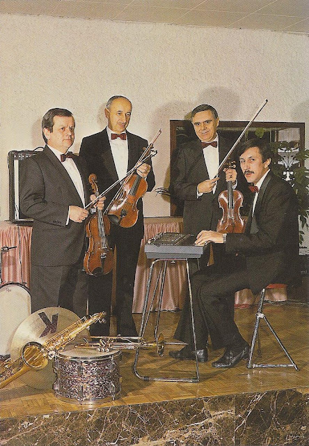 Davant: Salvador Junyent i Guitart (bateria i cantant), Leandre Ribera (trompeta, es va asseure al piano per la foto), Antoni Camprubí i Masana (piano i acordió), Francesc Camprubí i Masana (saxo, violí i cantant) i Jaume Junyent i Guitart (saxo i violí).
