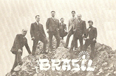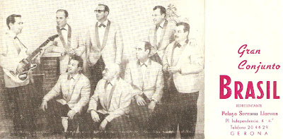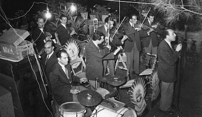 Aquesta foto, on estan interpretant un balada (observa les "escobilles" del bateria, i la "violinada" que acompanya amb delectació), i on gairebé es pot olorar la nit estival a sota dels pins, me l'ha passat en Josep Bataller, fill d'un dels components, i també m'ha identificat algun músic: