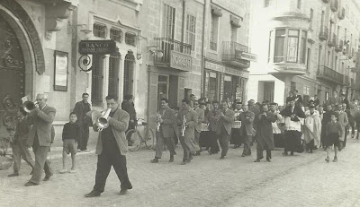 A la processó de Sant Antoni, on només s'hi veu un músic, amb el violí, a l'esquerra: Pere Ferrer i Sans. La foto està feta a la Plaça de l'Ajuntament.