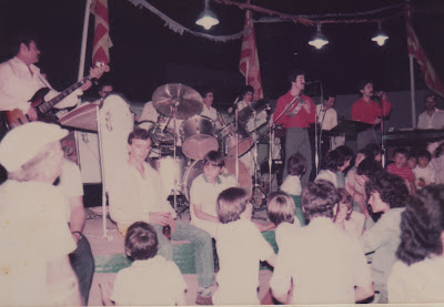 En plena revetlla de Sant Joan, al barri de Vilartagues, de Sant Feliu de Guíxols, amb el cantant Jordi Cort (camisa vermella, a la dreta) i el muntador de l'orquestra, a qui li deien en "Tejero", que es vestia com el cantant i feia com si fós el segon cantant (camisa vermella, a l'esquerra), amb la sana intenció de "lligar"
