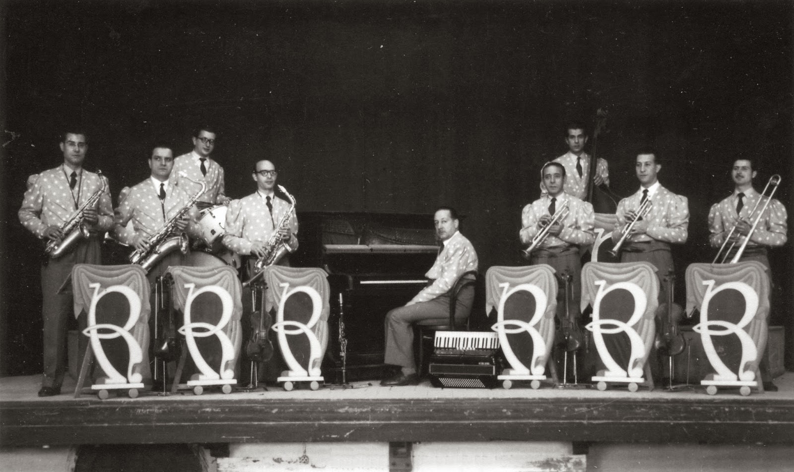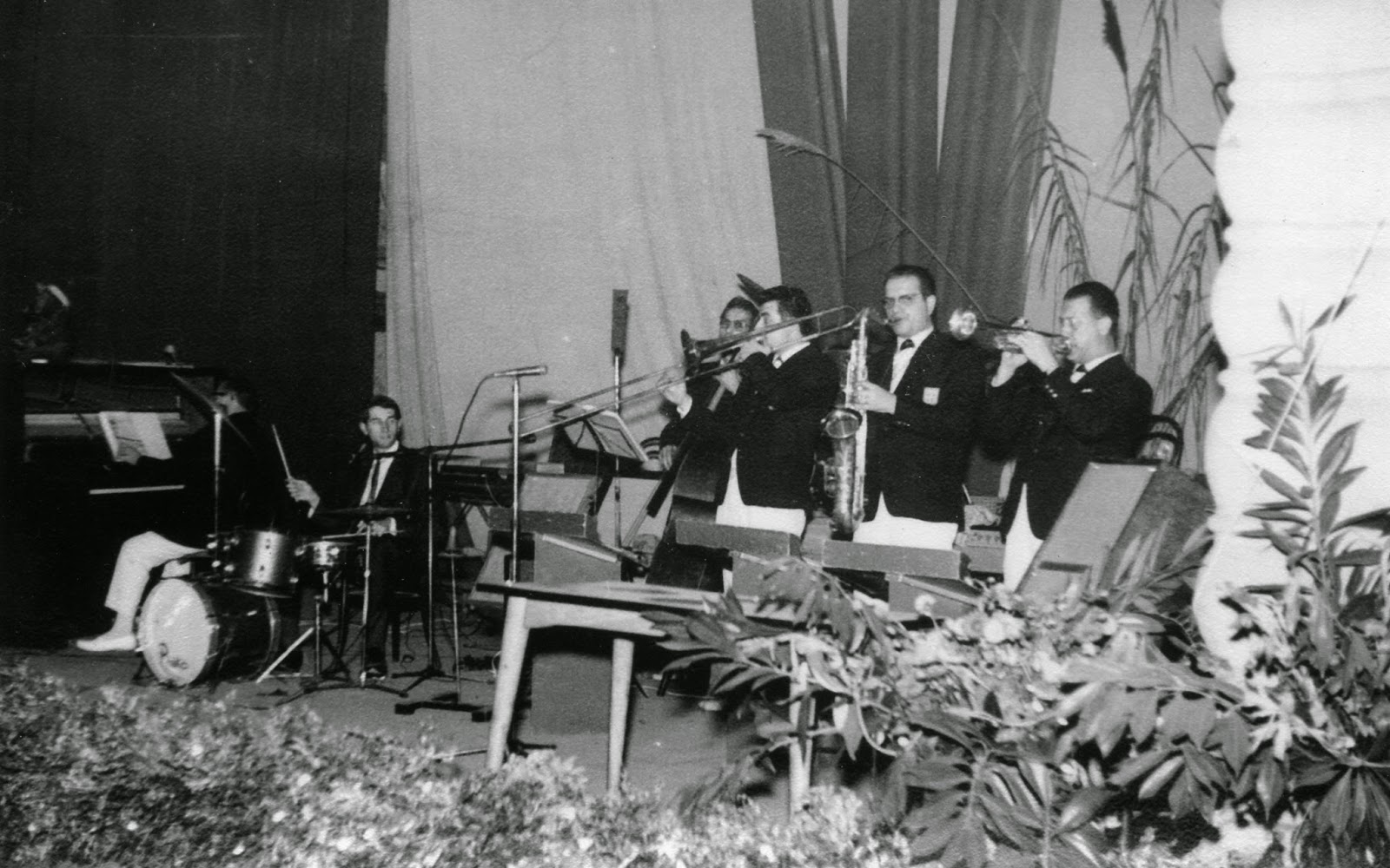 Davant: Bartolome Mesquida i Lliteras (president del Casino Menestral, a la bateria), Gabriel Pallisera (trompeta), Carles Varela (saxo) i Josep Pagès (violí)