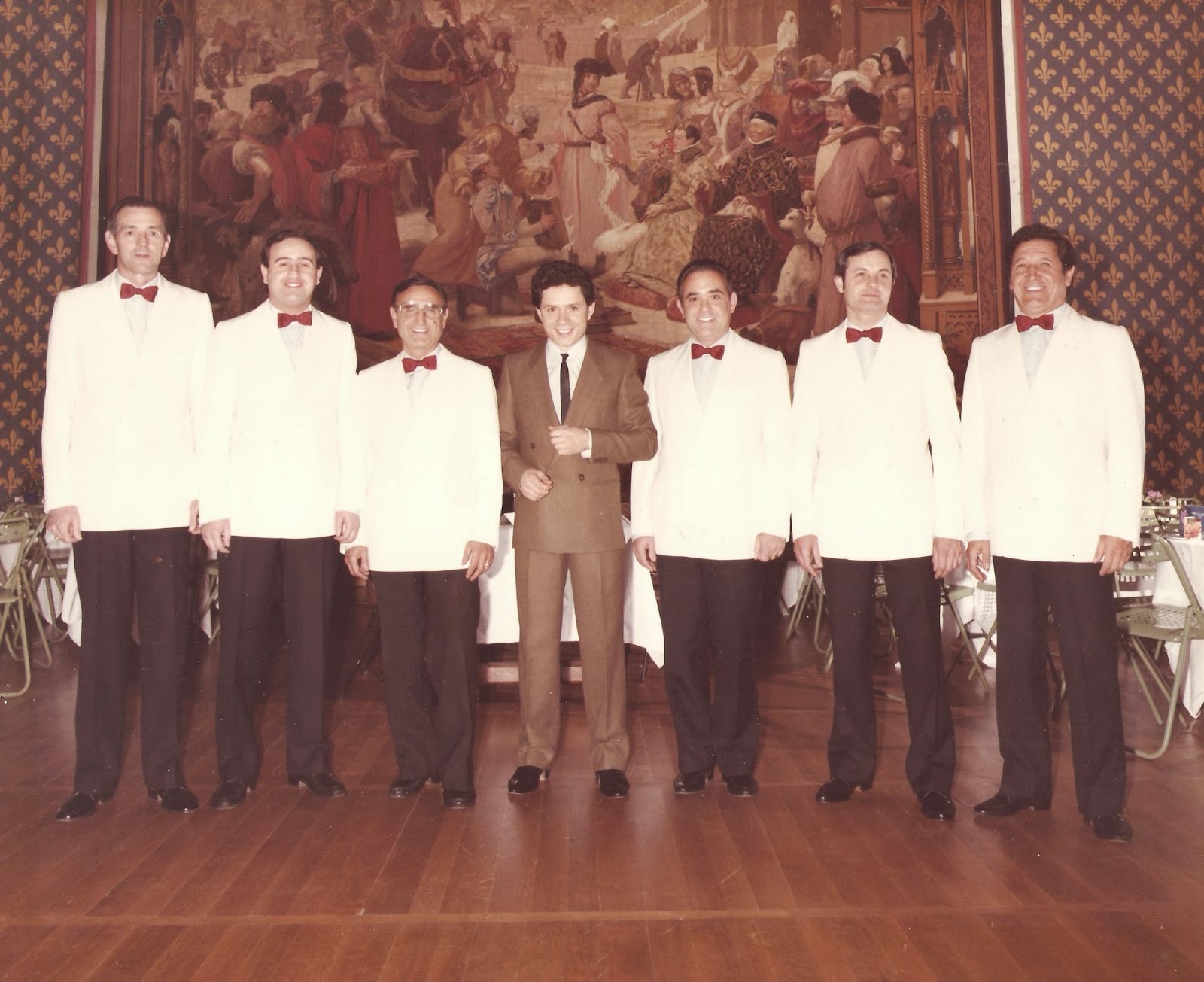Aquí veiem tres dels components tocant per a la taula presidencial d'un àpat celebrat a l'hotel Fornells Park, de Fornells de la Selva, amb motiu de la presentació del brandy Byass 96, del grup González Byass.