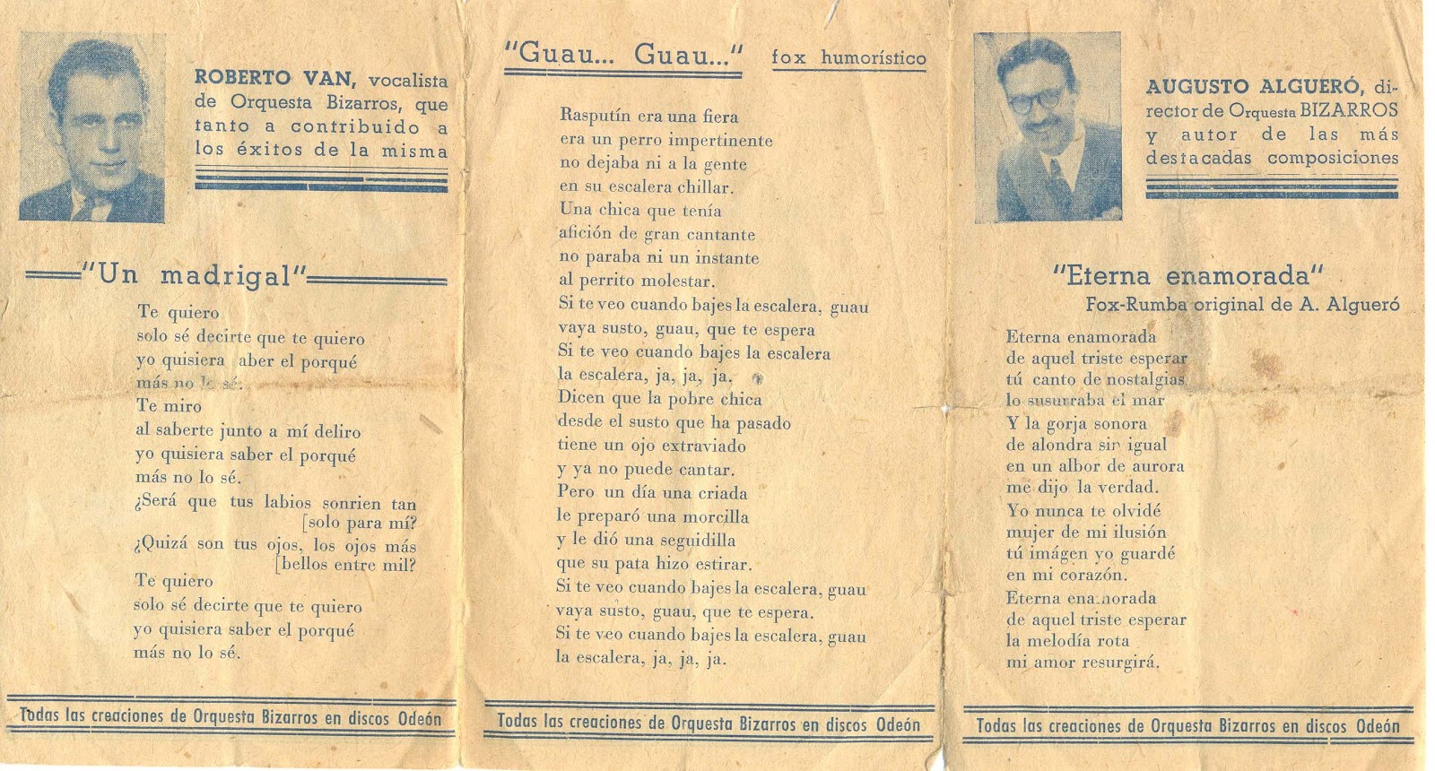 A dalt a l'esquerra, el cantant, violinista i trombonista argentí, que també va tenir la seva pròpia orquestra, Roberto Van. A la dreta, el pianista i director, August Algueró i Dasca.