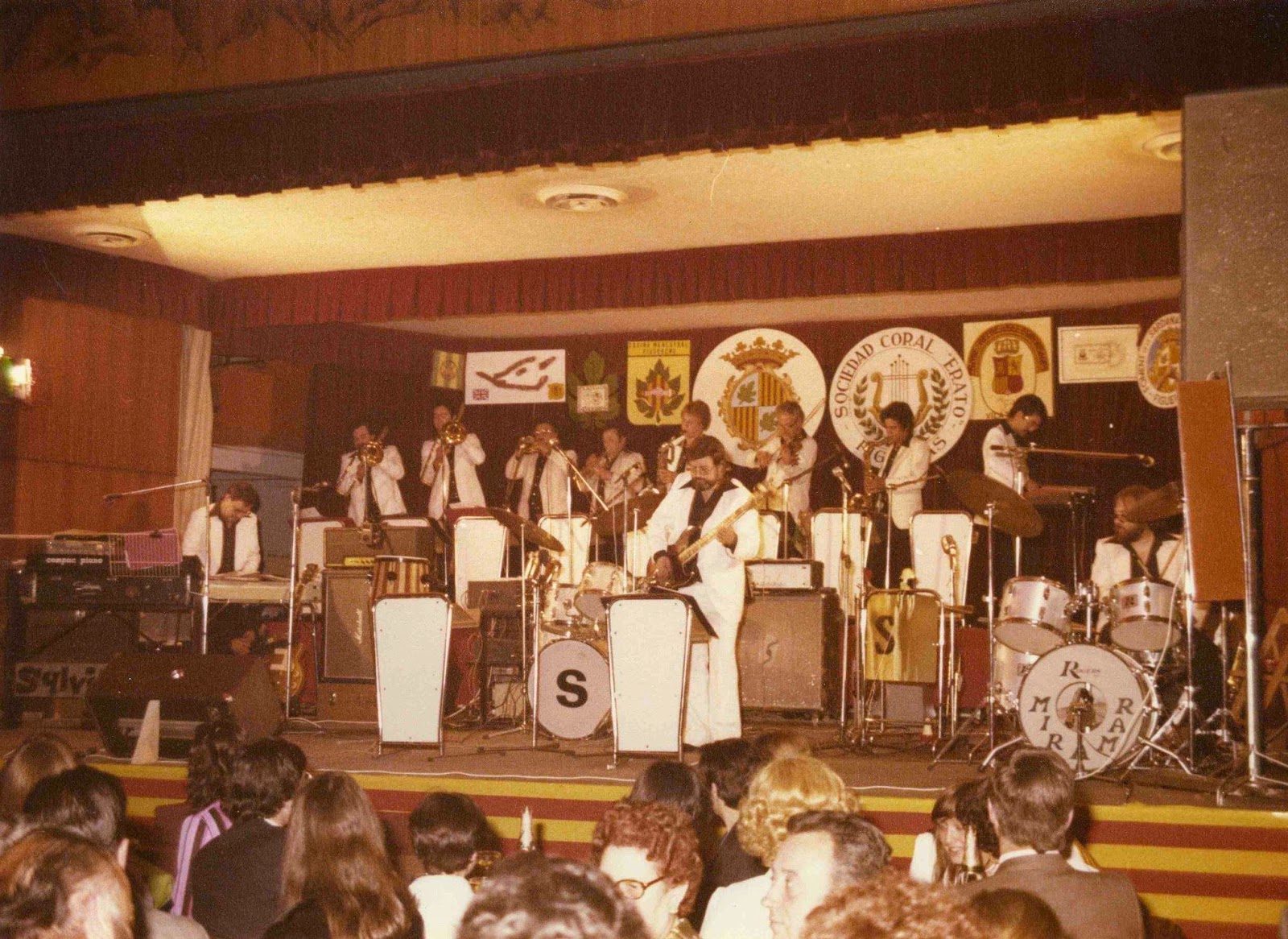 Al mig, a l'esquerra, el metall: Josep Lluís ["Pitu"] Castelló (trombó), Robert Bosch ["Pacheco"] (trompeta), Olegari Freixas i Darder ["Gari"] (trompeta) i Jordi Peña (trombó)