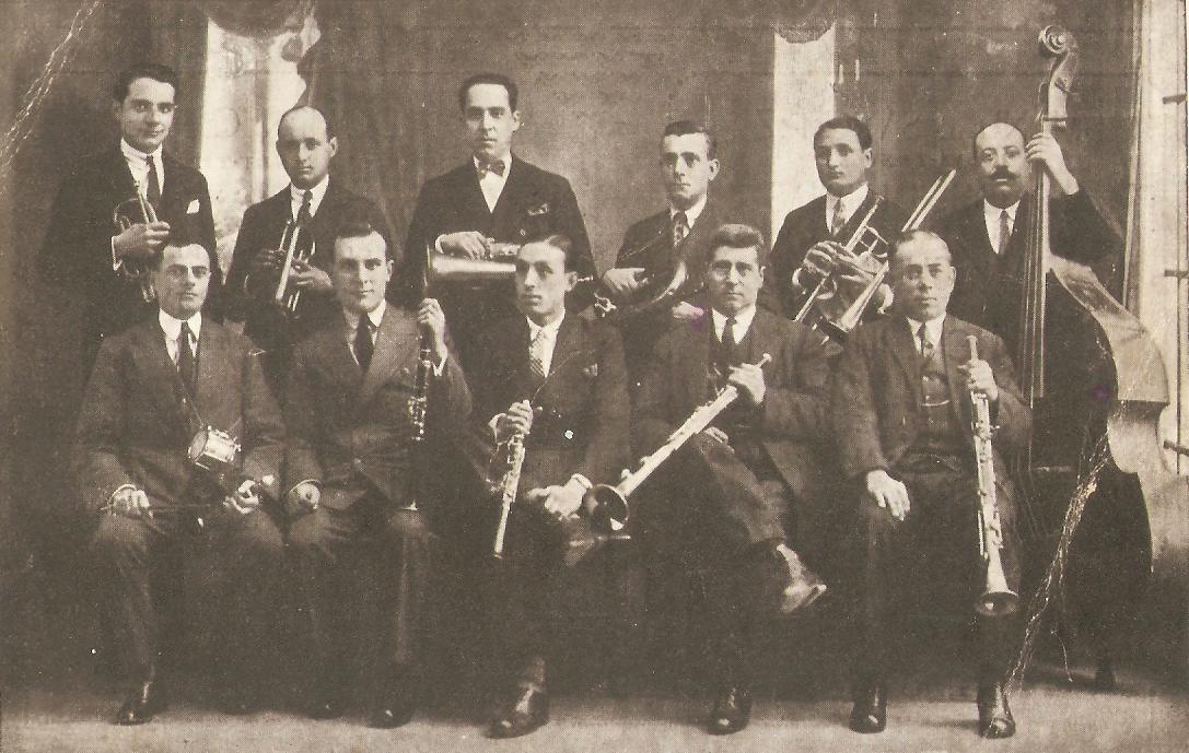 Darrere: Joan Poch (2n cornetí), Ernest Llopart (1er cornetí), Joan Grau (1er fiscorn), Joaquim Llenas (2n fiscorn), Joan Guillaume i Costejà (trombó, que havia entrat el mes de Novembre de 1928 al lloc de Joan Turró) i Manuel Nicolau (contrabaix)