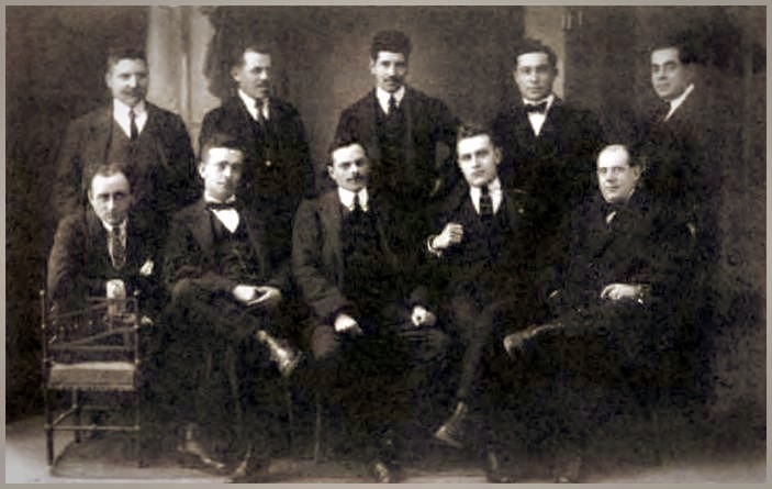 Al mig: Pere Planas (violí director i trombó), Artur Renart i Mercader (violí solista i 2n tible), Joaquim Llenas (1er violí, flauta i 2n fiscorn), Manel Sánchez i Solà* (viola i 1er tenor, havent debutat a la Nova Armonia l'any 1908) i Pere Avellí (contrabaix)