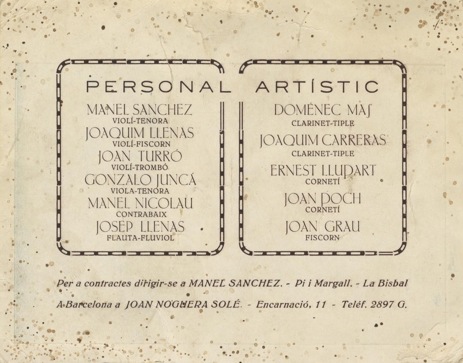 I tancant el díptic hi ha la relació del personal artístic. Remarquen que són una Cobla Ampurdanesa, segurament fent referència a que tocaven les sardanes amb els instruments típics (flabiol, tibles, tenores, etc.). Si tocaven més d'un instrument, poso primer el de cobla i després el d'orquestra.