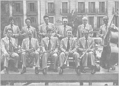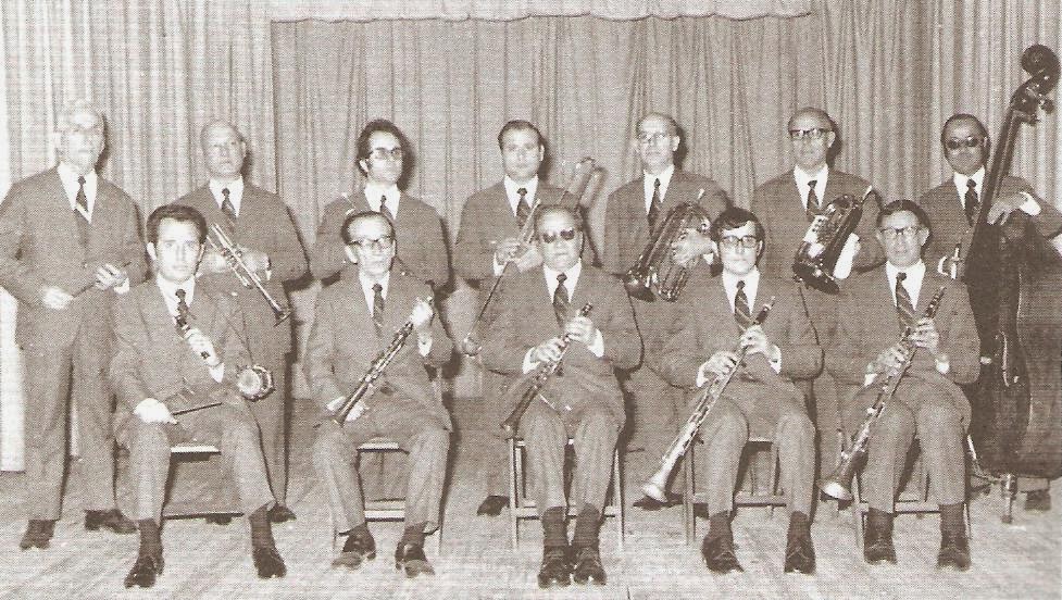 En primer terme (7): Enric Yáñez i Soria (2n tible), Indaleci Boigues i Álvarez (1er fiscorn), Jordi León i Royo (1er tible), Josep Vilà i Figueras (flabiol), Josep Jáimez i Mellizo (trombó), Josep ["Pitu"] Moriscot i Pons (contrabaix) i Josep Colomer i Ribera (2n tenor).