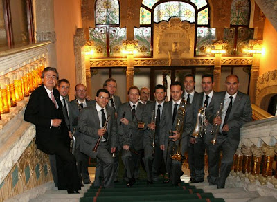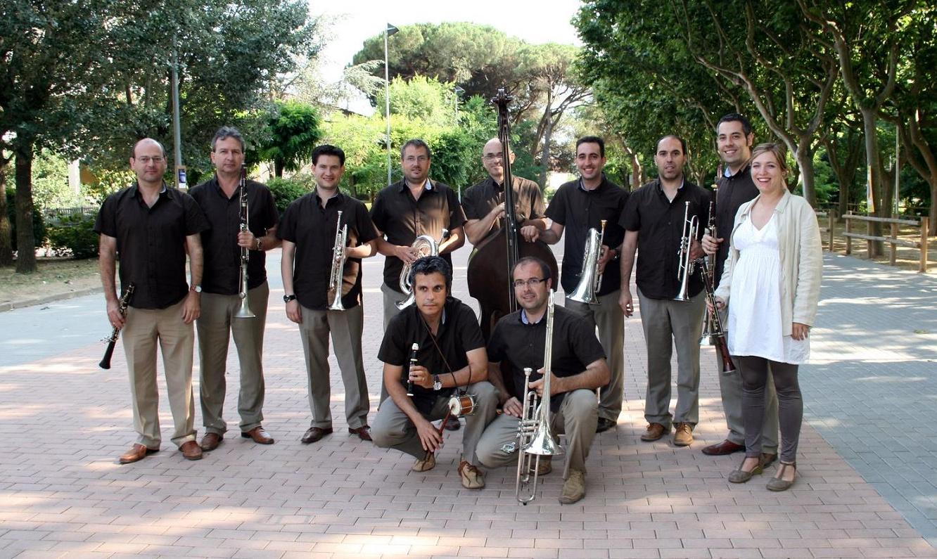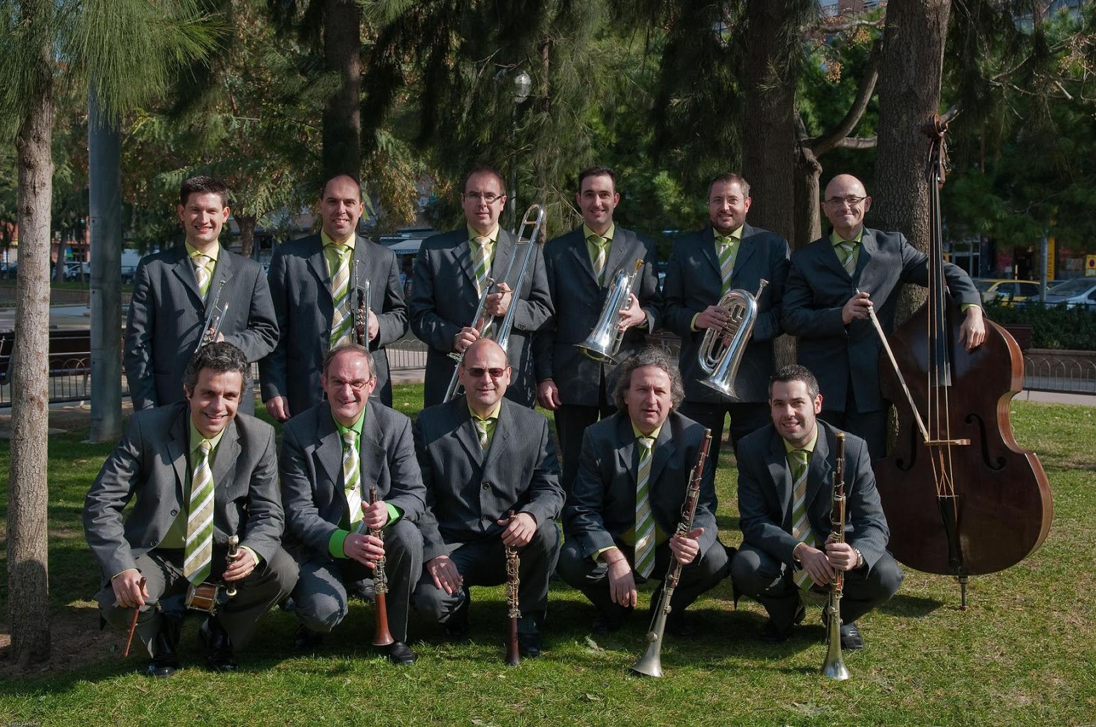 Drets: Jaume Salla (2n trompeta), Josep Jáimez (trombó), Jordi León (1er tible), Indaleci Boigues (2n fiscorn), Andreu Fernández (1er trompeta), Amadeu Escoda (1er tenor), Enric Yáñez (2n tible) i Josep Vilà (flabiol)