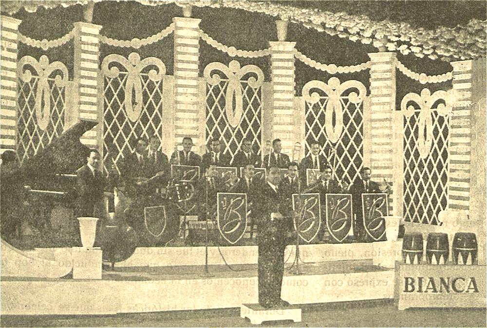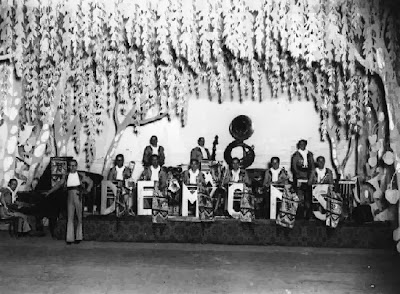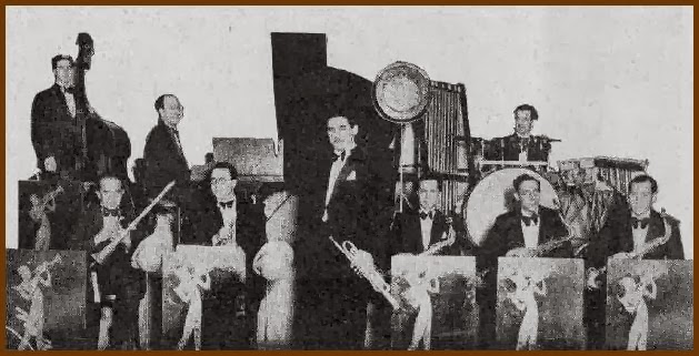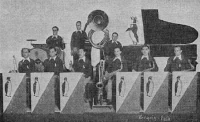 Orquestra de Barcelona formada l'any 1927 a ran de l'escissió d'uns quants músics de l'Orquestra Moderna Artística. Poso els instruments tal com els denominen en el revers de la postal (imatge següent). Tinc algun dubte doncs en aquest text posa que a la formació hi ha tres saxofons tenors i un saxofon soprano. El soprano, que podria ser corbat, seria el tercer músic per l'esquerra dels que estan drets. Els dos altres saxos que es veu, semblarien alts i no tenors.