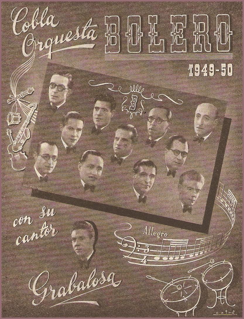 A baix de tot: Josep Mª Grabalosa, conegut artísticament només pel seu cognom. En Grabalosa tenia molt bon estil i bona veu, i una vegada que van alternar al Coliseu amb l'Orquestra d'Antonio Machín, eren les Fires de Girona, es veu que quan es va acabar el ball l'artista cubà va dir a l'empresa que els havia llogat que no volia tornar a alternar mai més amb l'Orquestra Bolero ... sembla que la gran estrella del moment no va païr bé alternar amb un cantant que rebia tants o més aplaudiments que ell.Foto: Barber. Cartell: Lluís Cairó i Soms.