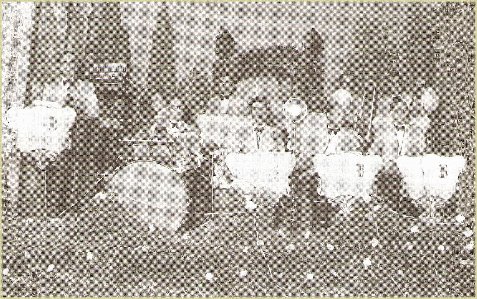 Darrere: Juli Armengol (contrabaix, no sé on seria el mestre Viader, potser feia el servei militar), Josep Aznar (trompeta), Manel Saderra (trompeta i director) i Ferran Prunell (trombó)