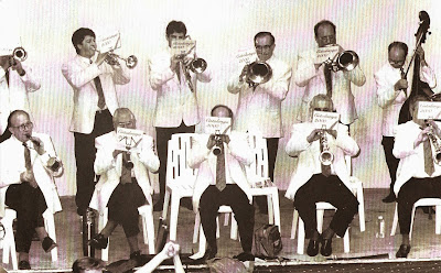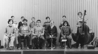 Darrere: Desconegut (contrabaix), Xxx Parés (no sé quin instrument), Desconegut (crec que trompeta) i Miquel Saló (trombó, que el té penjat al suport, al costat del trompeta)