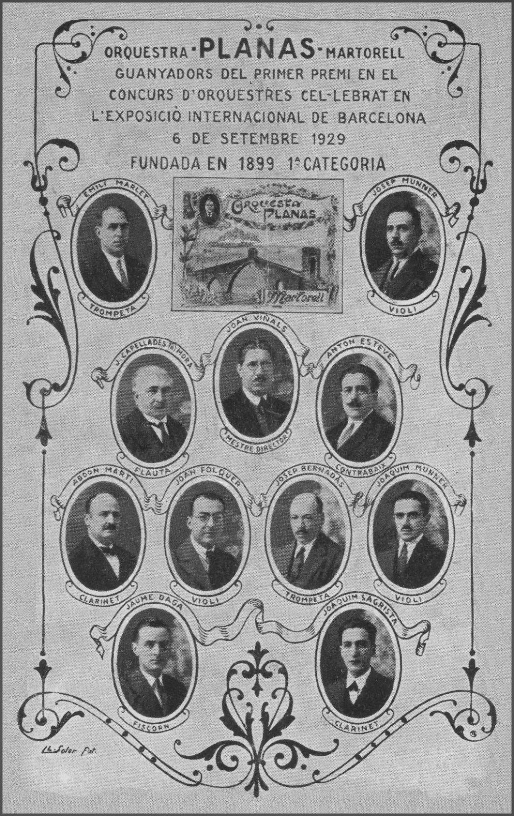 La data d'aquest carnet o postal la poso per aproximació. És molt probable que sigui de 1929: aquell any van participar en el Concurs d'Orquestres de Festa Major celebrat durant l'Exposició Internacional de Barcelona el dia 6 de Setembre de 1929, a la Plaça Major del Poble Espanyol. I van guanyar ! Es possible doncs que haguessin fet propaganda nova, en previsió d'aquella important actuació que havien de fer. Hi ha un requadre amb una foto, suposo que del fundador, Eusebi Planas.