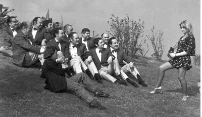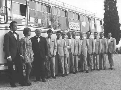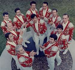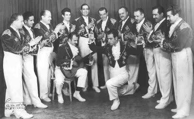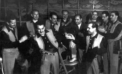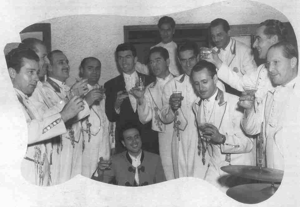 En primer terme: Julio Medina, cantant, que fa broma fent veure que dirigeix.