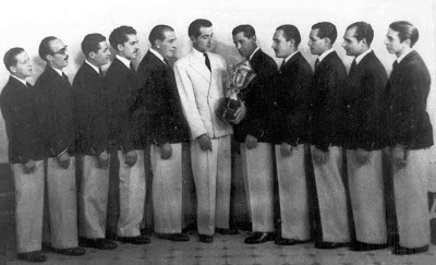 Amb la copa que els acreditava com a guanyadors del primer premi del Concurs d'Orquestres celebrat al Cine Roxy, a la plaça Lesseps de Barcelona, el dia 23 d'Agost de 1942.