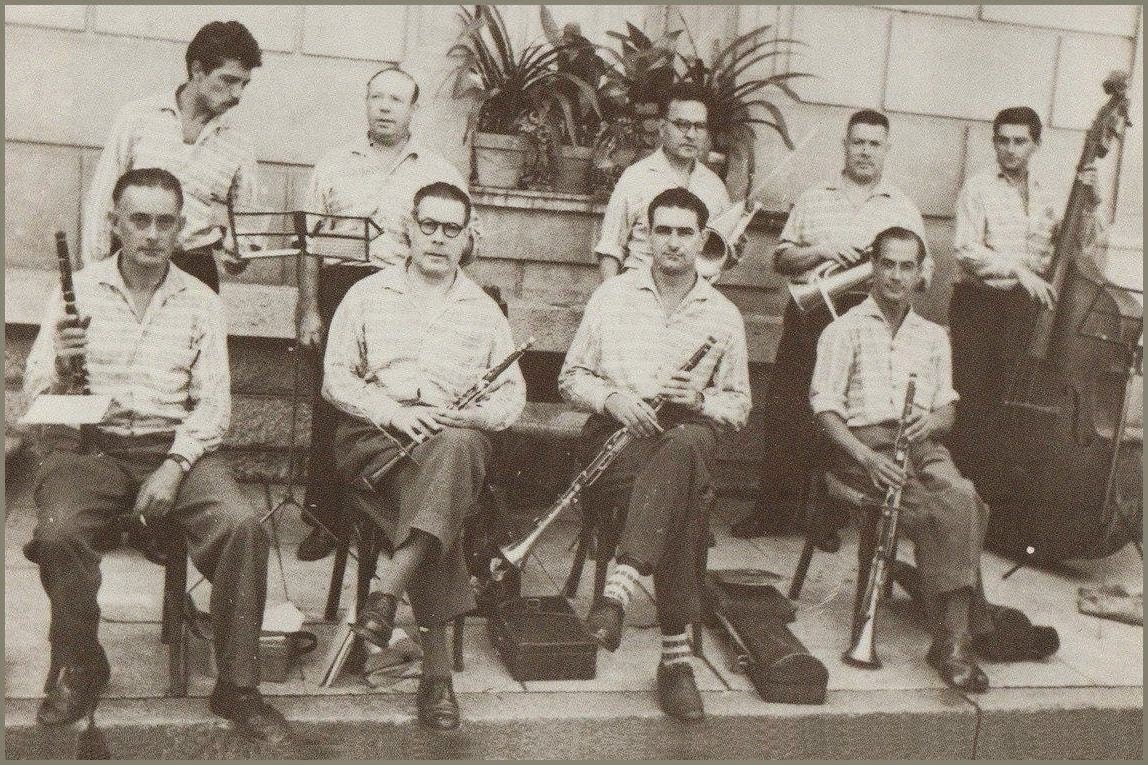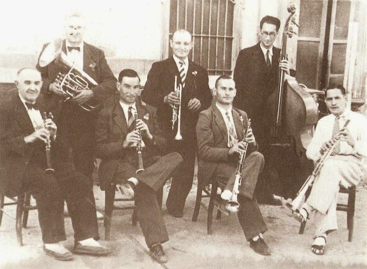 Cobla-orquestra de Salses fundada l'any 1938, retratats aquí a Sant Esteve del Monestir. L'antic alcalde de la població es va posar enmig dels músics, agafant un instrument.