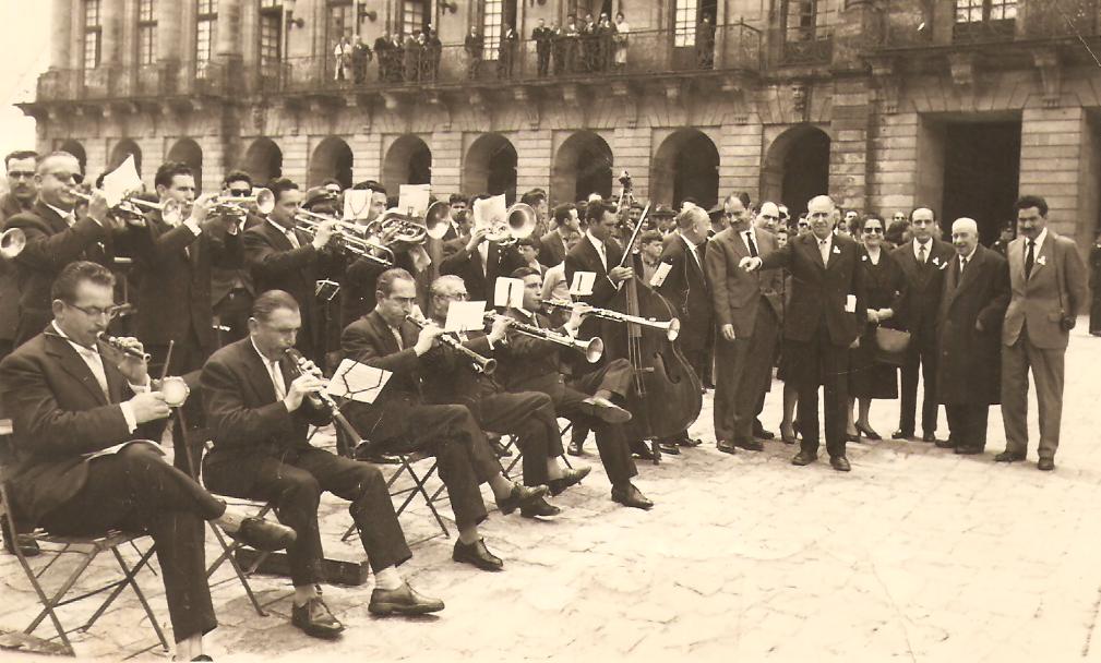 Tocant la sardana "A la meva mare", de Josep Grivé, a Santiago de Compostela, on van anar-hi acompanyant l'Esbart Verdaguer.