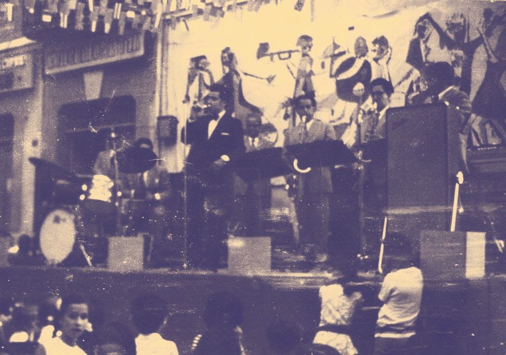 A baix: el trio de ritme: Desconegut (contrabaix), Salvador Tulsà (bateria i representant) i Josep ["Pitu"] Comalada (piano i representant, al qual vaig arribar a conèixer, ja molt vellet, l'any 1981)