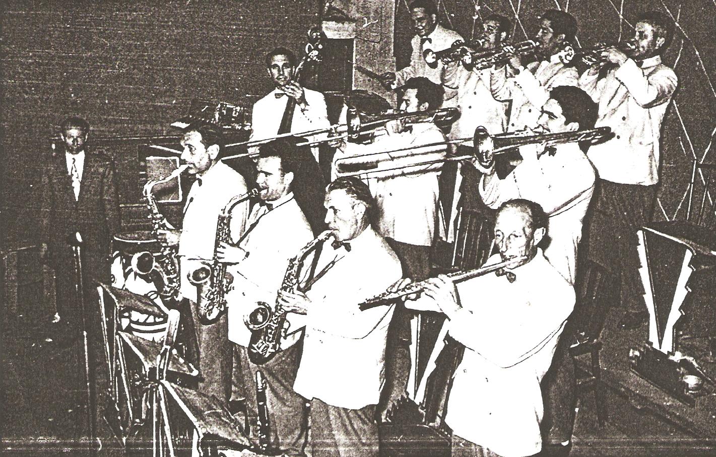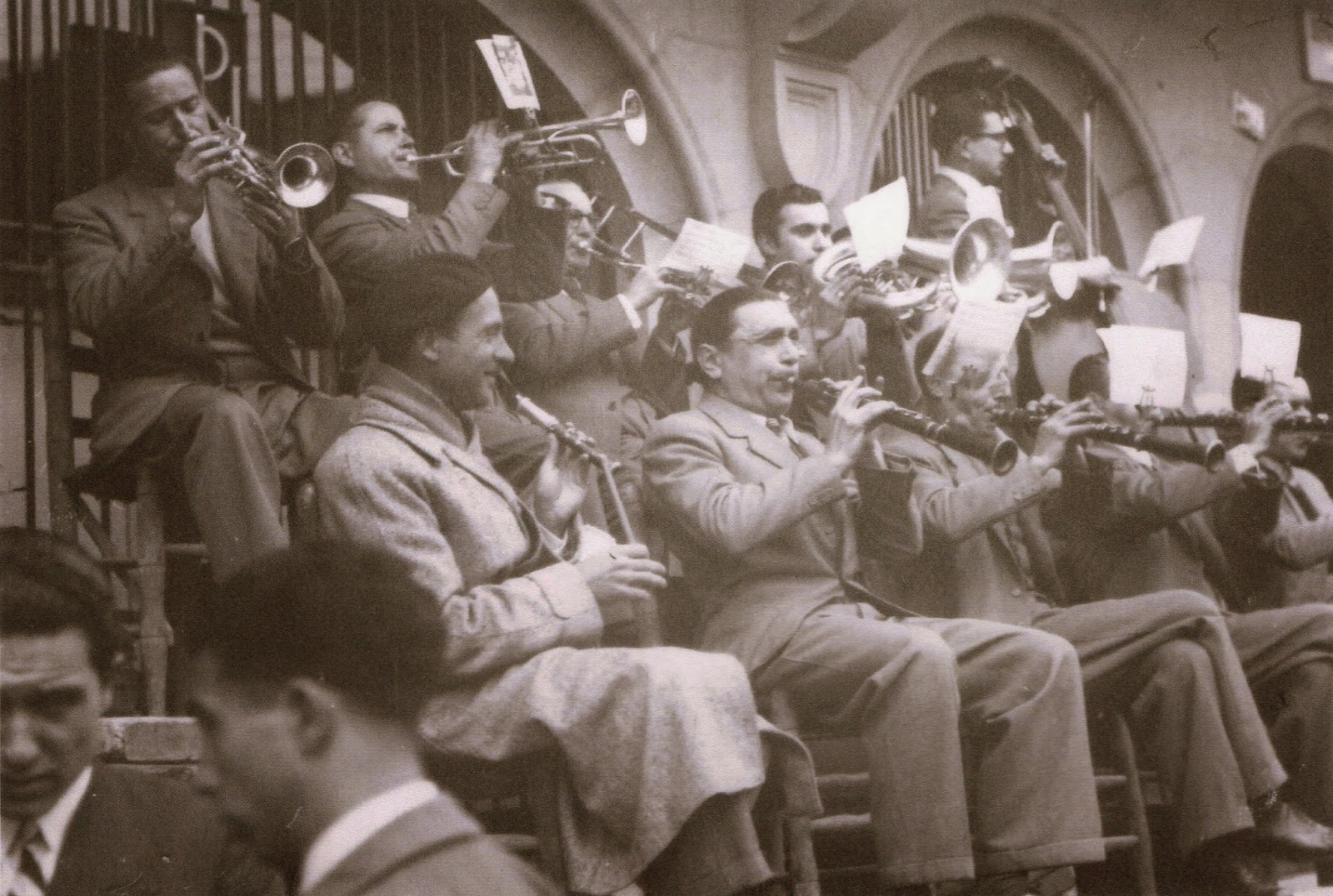 Darrere: Josep Bonet (contrabaix), Miquel Sarrà (trompeta), Joan Daranas (trompeta), Josep Masó (trombó), Joan Gifre (trombó) i Desconegut (cantant)
