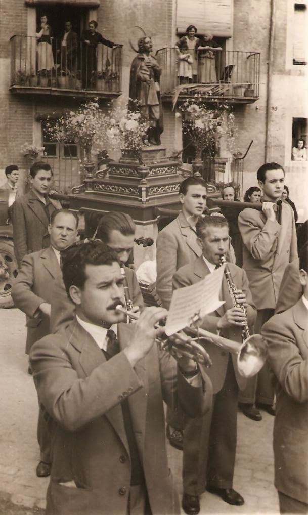 Acompanyant una processó. Reconec en primer terme a en Pere Rabaseda ("Pere Llebre") i en Joan Giralt al clarinet. A darrere, Rogeli Vilà al violí.