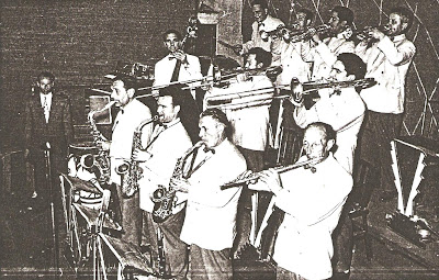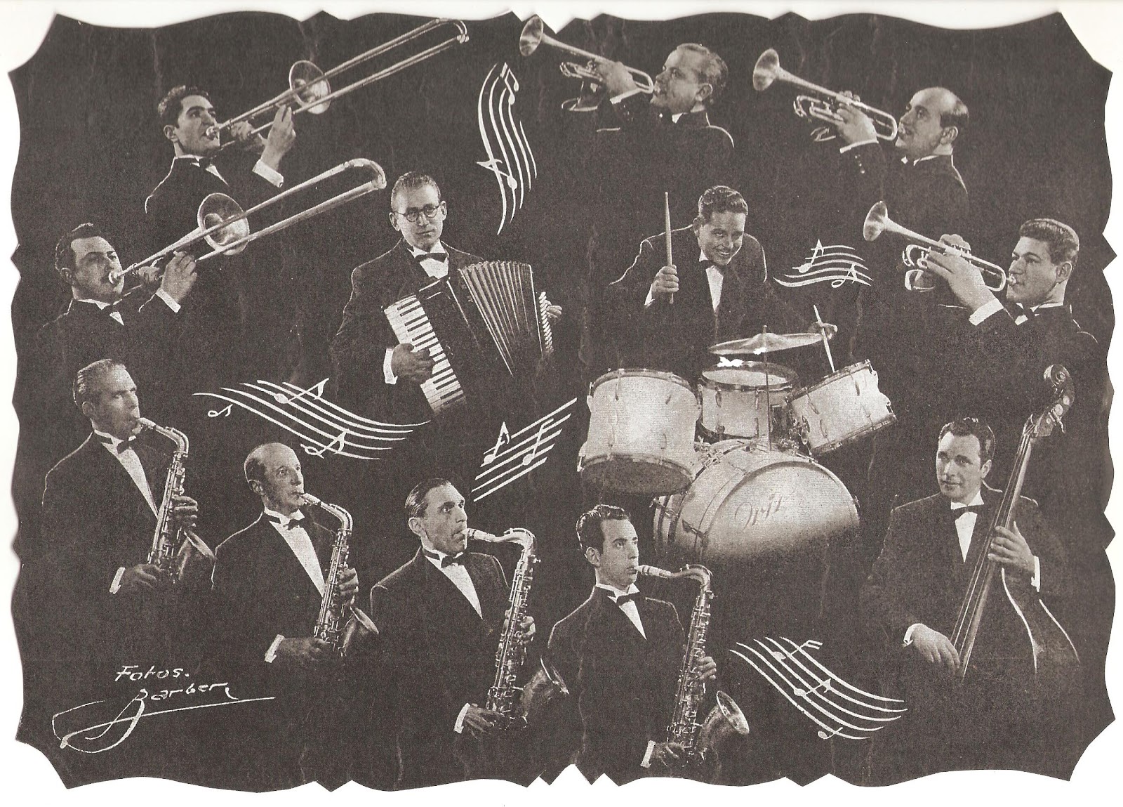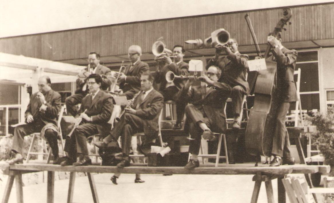 En segon terme: Enric Cabruja i Font (saxo tenor), Jaume Porcalla (saxo tenor), Rafel Roig (saxo tenor), Joan Giralt (saxo alt), Miquel Sarrà (trompeta), Joan Daranas (trompeta), Lliberat Juanals i Homs* (trombó) i Joan Gifre (trombó)