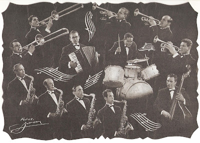 Davant: Salvador Dabau i Caussà (piano), Desconegut (bateria), Rogeli Vilà i Armengol (saxo tenor), Desconegut (saxo alt), Joan Giralt (saxo alt) i Rafel Roig (saxo alt).
