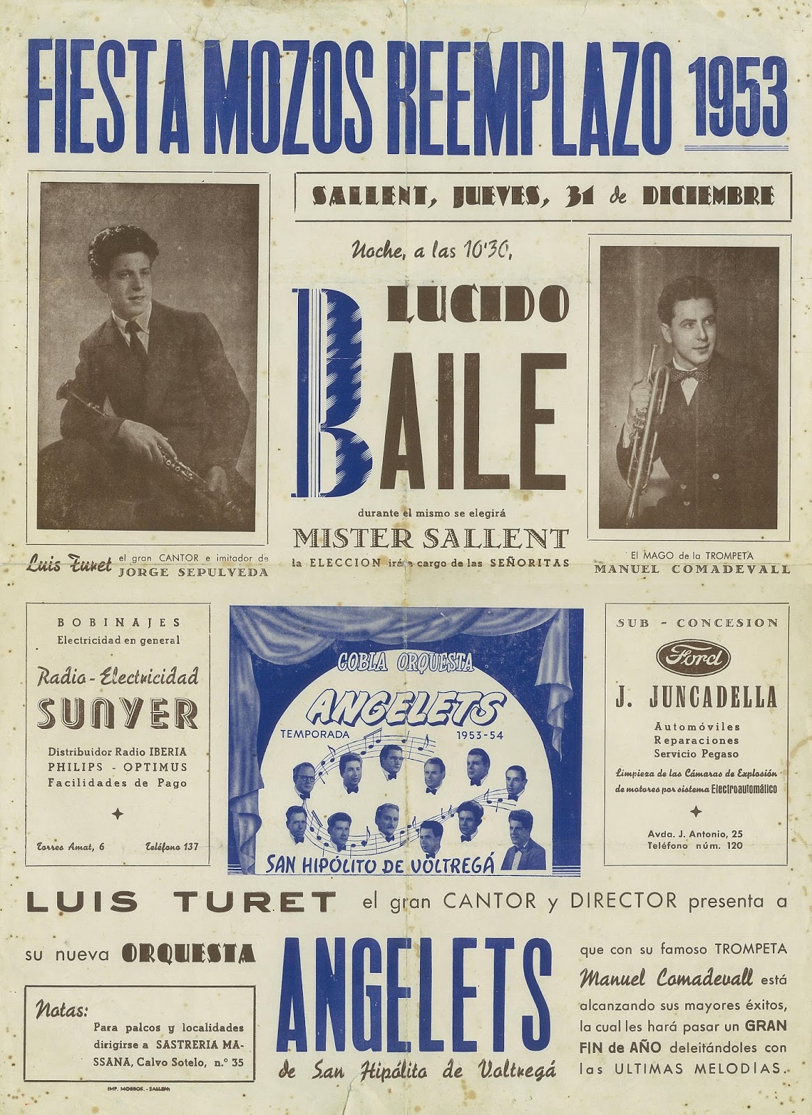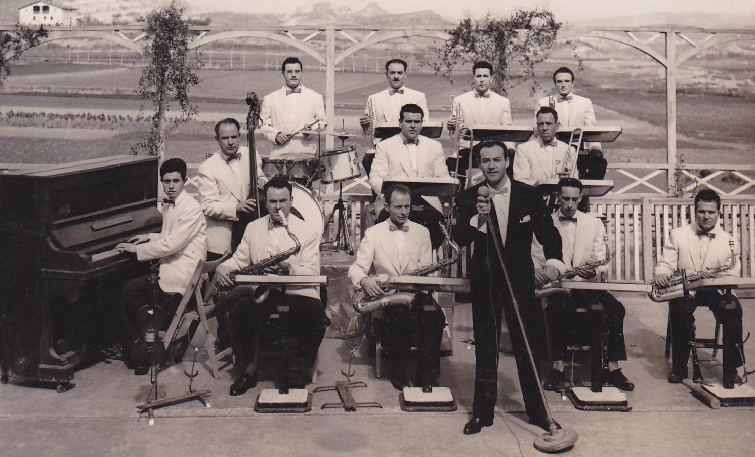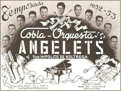 En primer terme: Francesc ["Paco"] Sánchez (cantant, trompeta i violí) i Josep Francàs (piano i acordió)