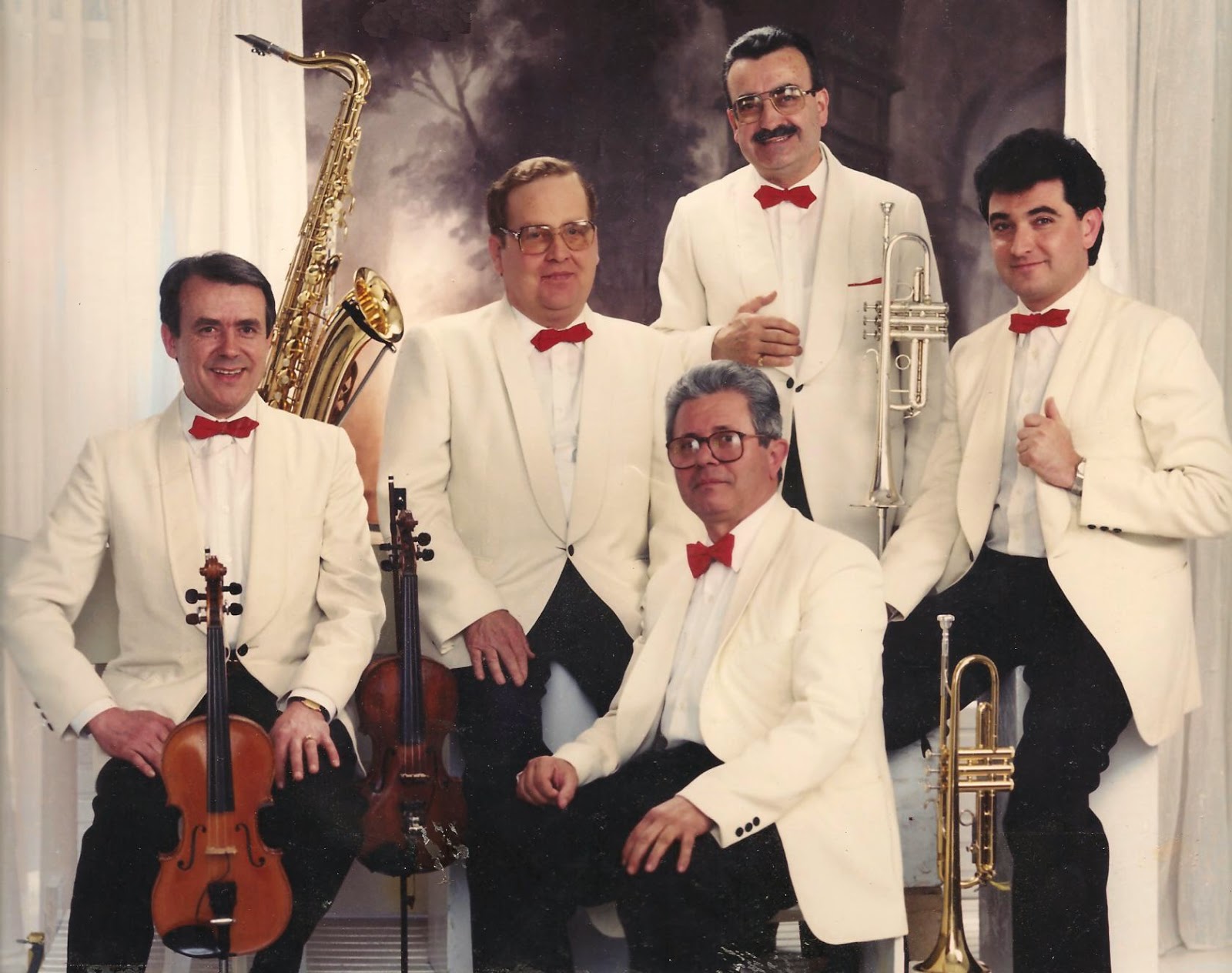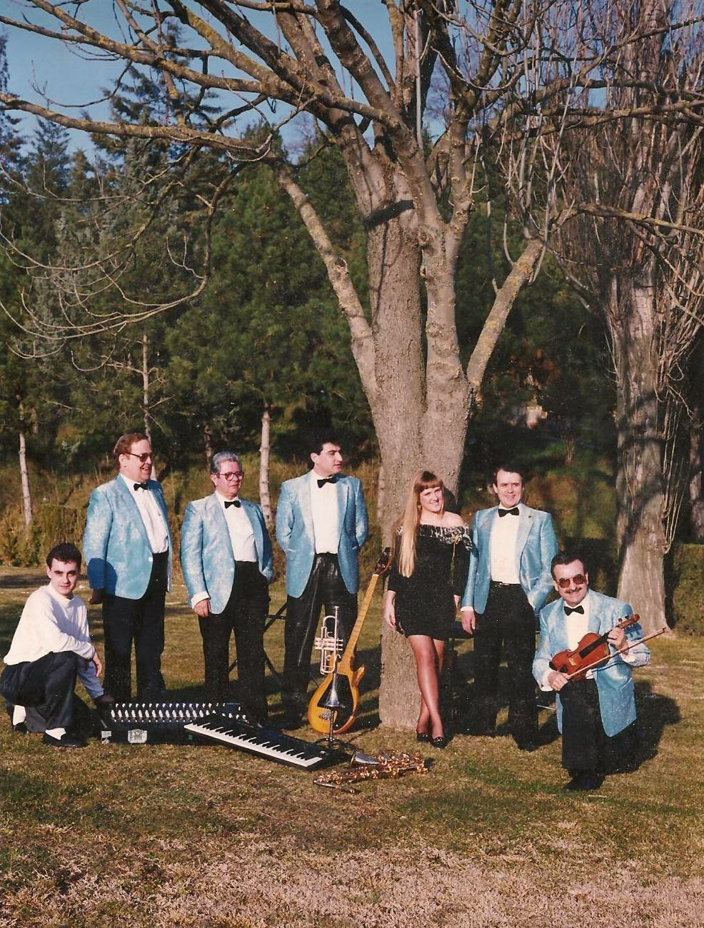 Drets: Santi Povedano (bateria), Jaume Buguñà (guitarra i cantant), Xxx Povedano (xofer, fill d'en Santi, que surt a la foto per fer més colla), Francesc ["Paco"] Sánchez (cantant, trompeta i violí), Joan Roca (trompeta), Josep Mª Bigas (baix i cantant) i Andreu Bigas (saxo tenor, violí, flauta i veus)