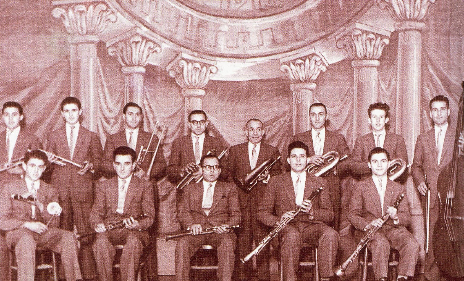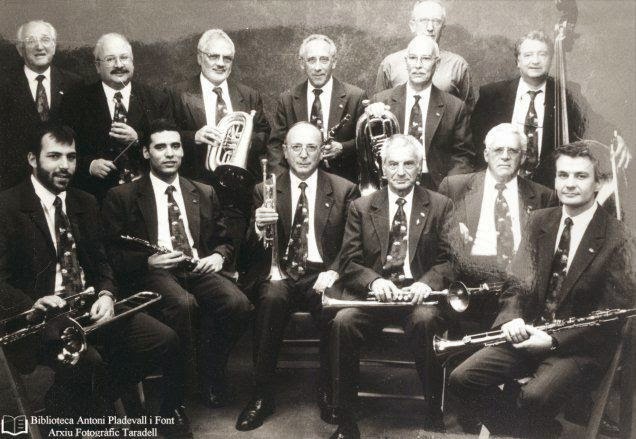 Davant: Lluís Casanovas i Blancafort (acordió), Lluís Casassas (saxo tenor), Joan Tuneu (saxo tenor), Joaquim Nogué i Farrés (saxo alt) i Jaume Codina (saxo alt).