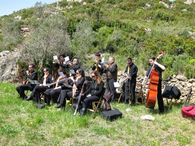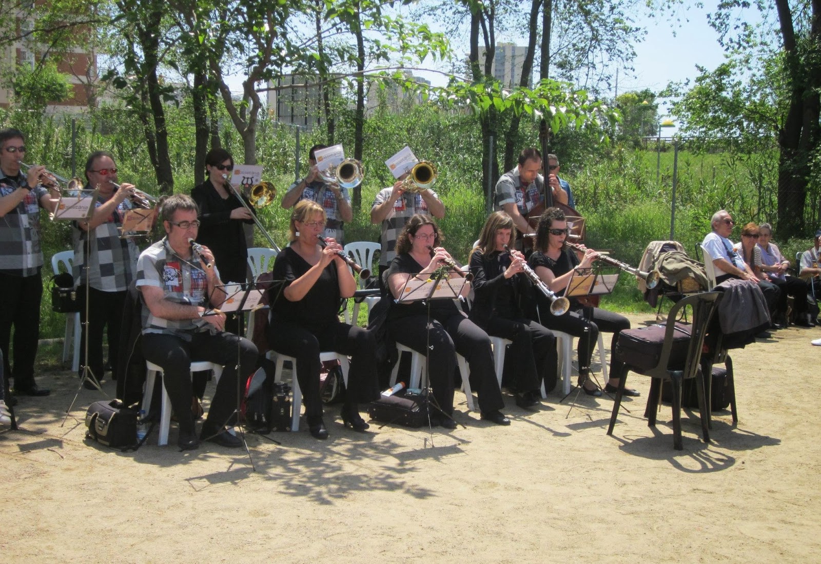 En primer terme: Cinta Pascual (tenora), Josep Mª Gual (trompeta), Mª Antònia Pujol (tenora) i Francesc Valls (contrabaix).