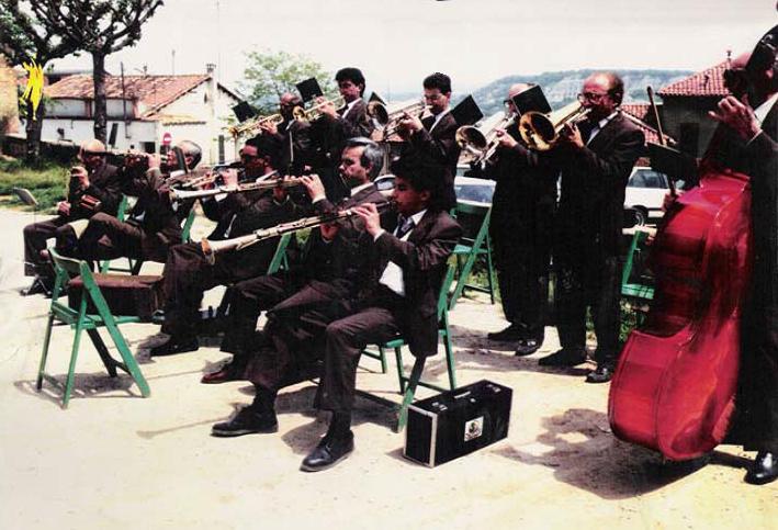 A la dreta, al costat de la Cobla, Eladi Peix, el taxista que va portar la Cobla en les seves actuacions durant 25 anys.