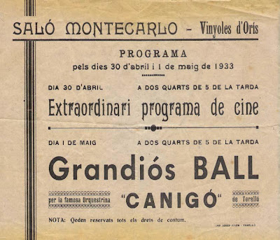 A la imatge: programa de la primera actuació de l'Orquestrina Canigó, l'any 1933, al Saló Montecarlo, de Vinyoles d'Orís.