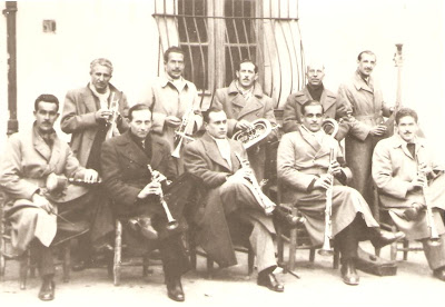 Davant: Josep Cirilo i Expósito (clarinet), Francesc Perich i Escosa ["Francisquet"] (clarinet: tot i ser un reconegut flautista, aquí tocava el clarinet, donat que el director era qui tocava la flauta), Joan Bas i Bancells (flauta i director), Desconegut (violí), Desconegut (violí) i Desconegut (violí).